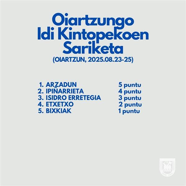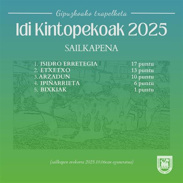 Elgoibarko kintopeko idi proben sariketaren ondoren, urte bukaeran ospatuko den 2025eko Gipuzkoako idi kintopekoen txapelketarako sailkapen eguneratua hau da: